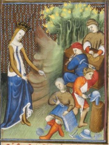 This illumination depicts the goddess Minerva standing on the left side of the image. The people in front of Minerva represents the inventions and discoveries Minerva introduced to the world. There is one man wearing a blue tunic and a red head garb playing a flute, and another man beside him creating iron weapons, which are both creations of Minerva. There is a person sitting on the ground who is spinning wool with their fingers, which is something Minerva discovered and showed men how to do. There is a man sitting at a desk at the back of the image who appears to be counting objects, which would signify Minerva’s discovery of numbers,
