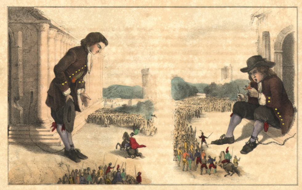 This image contains two scenes from Gulliver’s time as a captive at the castle in Lilliput. On the left, we see Gulliver speaking to the Emperor. The Emperor of Lilliput climbed down from the tower and threw himself onto his horse, startling the horse. The horse reared however the Emperor was a skilled horseman and stayed on the horse. Gulliver bows to the Emperor, seen in front of Gulliver with a cape blowing in the wind. On the right side we see Gulliver holding a Lilliputian and holds a knife in his hand. The guards were shooting arrows at Gulliver while he ate, and Gulliver pick one up in retaliation and threatened him with his knife.