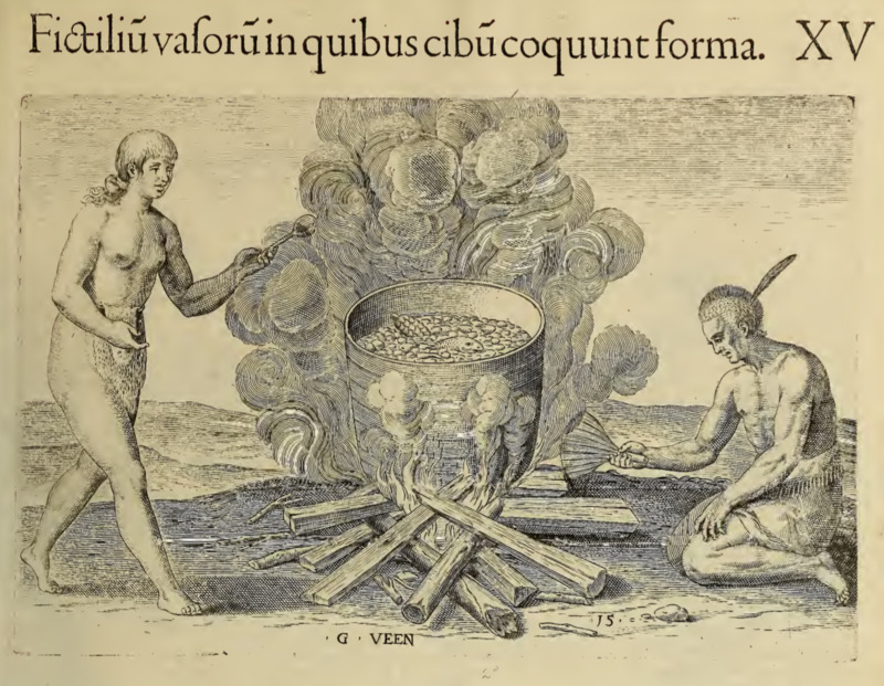 An Indigenous man and woman cook food in a large earthen pot over a fire. The woman holds a ladle, and the man kneels on the ground and fans the flames under the pot. Inside the pot a fish is identifiable, amongst other foods. Both individuals wear a fringed garment tied around their waist, and the man has a single feather in his hair.