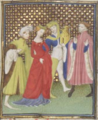 This illumination depicts the young woman named Megullia Dotata on the left side of the image wearing a red dress as she is being given away for marriage. The two figures standing beside her appear to be her mother and father. Megullia Dotata is known for having a dowry so massive that it was unheard of during her time. Her father is depicted giving the dowry to her new husband who is standing on the right of the image.