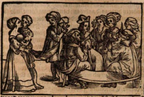 This engraving depicts Soaemias, a Greek woman, sitting in the middle of a meeting of the Roman senate with her son, Emperor Elagabalus. They are depicted sitting in a circle, with everyone looking at Elagabalus, who is illustrated wearing a crown and holding a scepter. Elagabalus would not have become emperor without his mother’s help, so he granted her the ability to have authority and did nothing without her consent. This image is highly significant as she was, as Boccaccio explains, the first woman to have a seat among the Roman senate and discuss her opinions and views on what must be done. The left side of the engraving depicts Soaemias kissing a man to represent her life as a prostitute before becoming mother to the emperor.