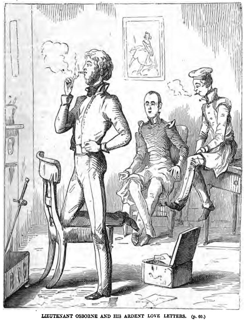 George Osborne stands facing the fireplace with one leg resting on a wooden chair, smoking a cigar which he has lit using a love letter. At the base of the chair is an open chest, filled with letters from Amelia Sedley. Two other officers are seated in the background. One is sitting on the edge of the desk, also smoking. The other is Dobbin, seated in an armchair over which a portrait of a woman hangs, looking startled. Below the illustration is printed its title and location in the story, “LIEUTENANT OSBONE AND HIS ARDENT LOVE-LETTERS. (p. 60.)".