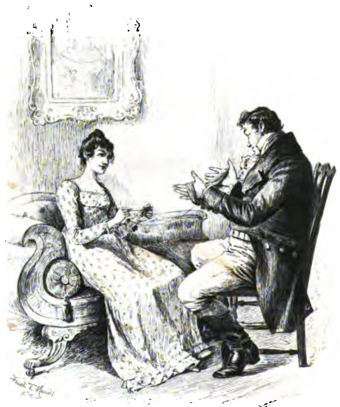 The image depicts a scene from Chapter IV in which Joseph Sedley is helping Rebecca Sharp make a green silk purse. Rebecca Sharp is seated on a lounge chaise holding a string which winds around the hands of Joseph Sedley, who is seated opposite her on a wooden chair. A faded portrait hangs on the wall behind the chaise.