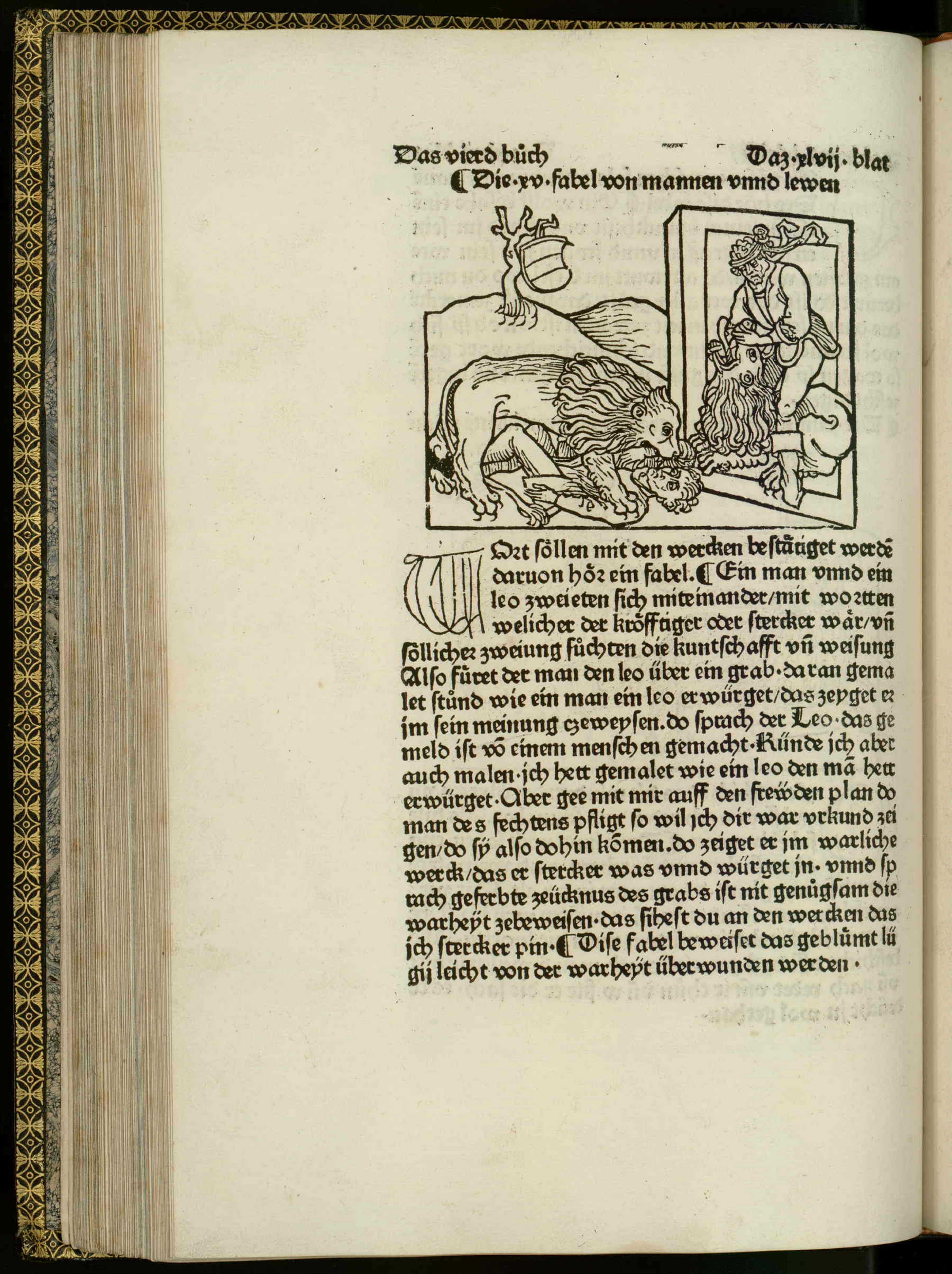 - On the left side, there is a shield hanging on a tree. Below that there is a lion attacking a human. On the right side, there is a man fighting a lion in a box.