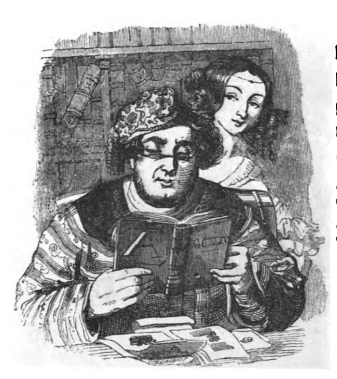 Here we see Gulliver sitting at a table reading a book. The image appears at the beginning of chapter twelve, where he reflects on writing his book. The book Gulliver is holding is likely an early edition of the book he wrote. His daughter is seen over his shoulder. The same image appears in the 1839 Krabbe edition.
