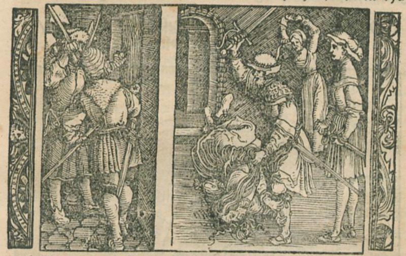 [Act XII (Second Illustration) – The Alguacil’s Men Knock on the Door as Sempronio Murders Celestina]