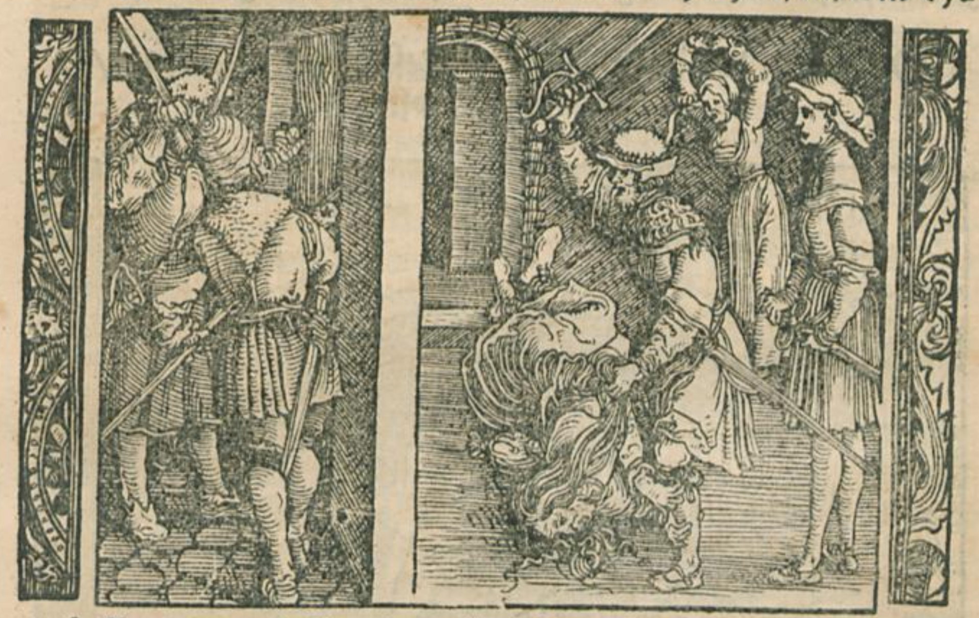Sempronio (figure with his sword raised) and Pármeno (rightmost figure) go to Celestina’s house. They ask Celestina (figure lying on the ground) to fulfill her promise and give them a share of the gold chain given to her by Calisto. She refuses, making up countless excuses and lies in order to escape her obligation. Sempronio draws his sword and threatens her, but she refuses to forfeit part of her reward and calls on Elicia (figure between Sempronio and Pármeno) for help. Sempronio begins striking her, and both she and Elicia scream in horror, calling for the alguacil’s men (the soldiers in the left panel of the illustration). Sempronio and Pármeno hear the men approaching the door and flee upstairs to the third storey. Realizing they have no other recourse for escape, they jump from the window.