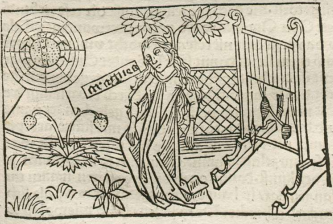 This engraving depicts Arachne killing herself by means of hanging. We know that this is Arachne as her name is engraved beside her body. There is a loom on the right-hand side of the engraving and a net to the left of the loom. Boccaccio explains in his story that Arachne is known by ancient writers as being the one who discovered the uses of woven wool and the first to make nets. Arachne became too confident in her wool work and challenged Minerva to a weaving competition. After the goddess had won, Arachne hung herself, as depicted in the engraving. There is a spider on a spider-web on the left side of the engraving, as Arachne is said to have been transformed into a spider after this event.