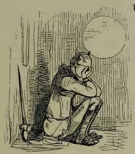 A figure in a winged cap sits with his elbows on his knees and his face in his hands. A sword with a thick, rounded handle leans against the wall, point up. Above his head is the moon, which forms the letter O from “Our”.