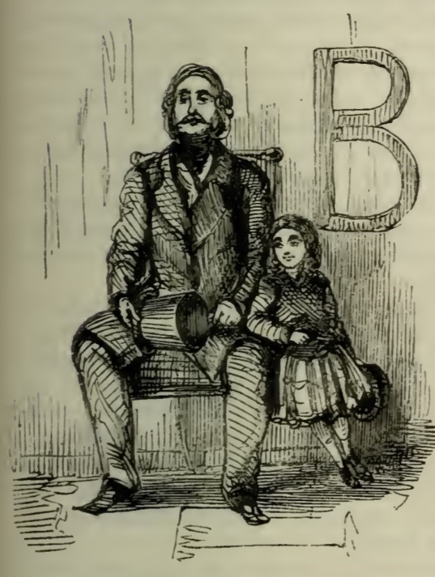 A tall man is seated on a chair, holding his hat in his hands. A young girl, also holding a hat, leans against his side. In the top right of the image is the letter B, from “Becky”.