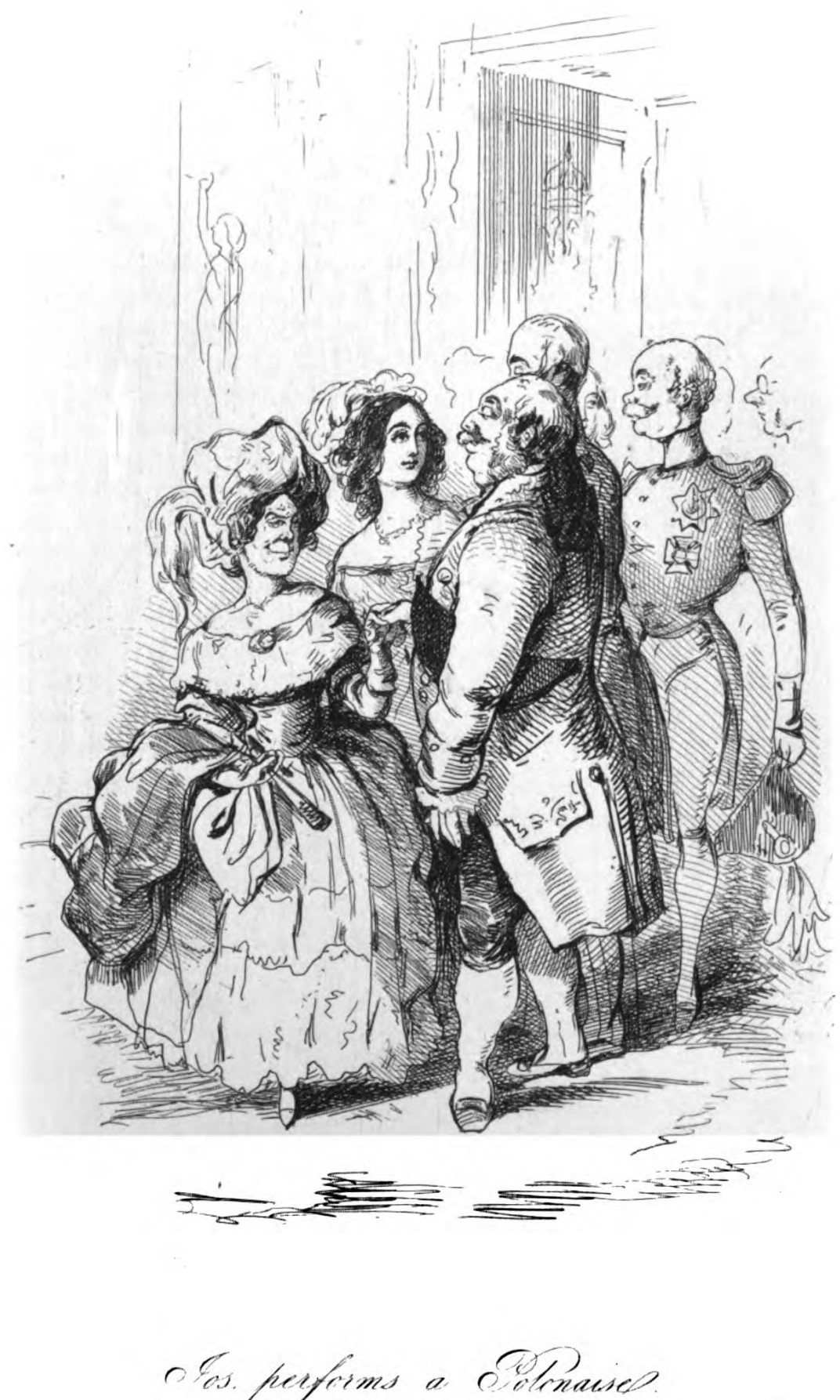 Joseph Sedley stands opposite the Countess of Schlüsselback, holding her hand as they walk a Polonaise at a Court-ball. Behind them in the row are Major Dobbin and Amelia Osborne, with another decorated officer in the pair after. Below the illustration is printed in cursive its title, “Jos performs a Polonaise”.