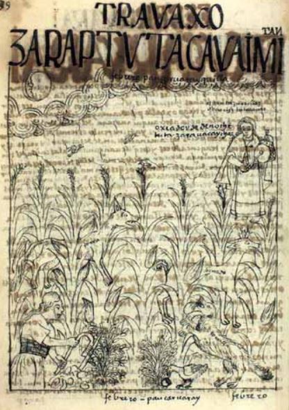 This image is reflected in the final chapter of Ayala’s chronicle where he provides a description of labours and festivals that occur in the rural areas of the Spanish colonial Andes during each month of the Inca calendar year. This image depicts the month of February, which was an important month for ensuring the safety of corn fields from hungry animals. There is an indigenous woman on the right side of the image standing behind the corn field holding a drum in her left hand and a stick to beat the drum with in her right. She is using the drum to scare animals away from the corn field at night. The moon in the top left corner reflects that it is night in the image. The writing above and beside the indigenous woman reads “espanta zurrillas de noche, oxeador de de noche, tuta zara uacaychac” [scares skunks at night, scouts and protects the corn at night]. In the corn field, there is an animal identified as a “zorra” [fox], “benado” [deer], and in the bottom right corner, a “zorrilla” [skunk]. There is an unidentified bird next to the skunk. There is an indigenous woman in the bottom left corner of the image harvesting the corn with an agricultural device in her hands. The caption at the bottom of the image reads “febrero, paucar uaray” [february, third month].