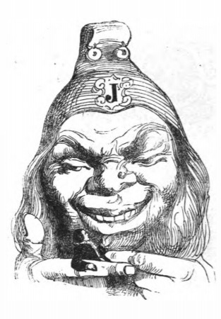 Here we see the Queen of Brobdingnag’s dwarf tormenting Gulliver. The dwarf holds Gulliver between his fingers as Gulliver leans away from him. The dwarf wears a pointed cap with bells. The letter “J” is on his cap, as it is the first letter of the chapter. The same image appears in the 1839 Krabbe edition.