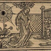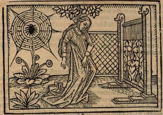 This engraving depicts Arachne hanging herself. There is a loom on the right side of the engraving and a net to the left of the loom. Boccaccio explains that Arachne is known by ancient writers as being the one who discovered the uses of woven wool and the first to make nets. Arachne became too confident in her wool work and challenged Minerva to a weaving competition. After the goddess had won, Arachne hung herself as depicted in the engraving. There is a spider on a spider-web on the left side of the engraving as Arachne is said to have been transformed into a spider after killing herself.