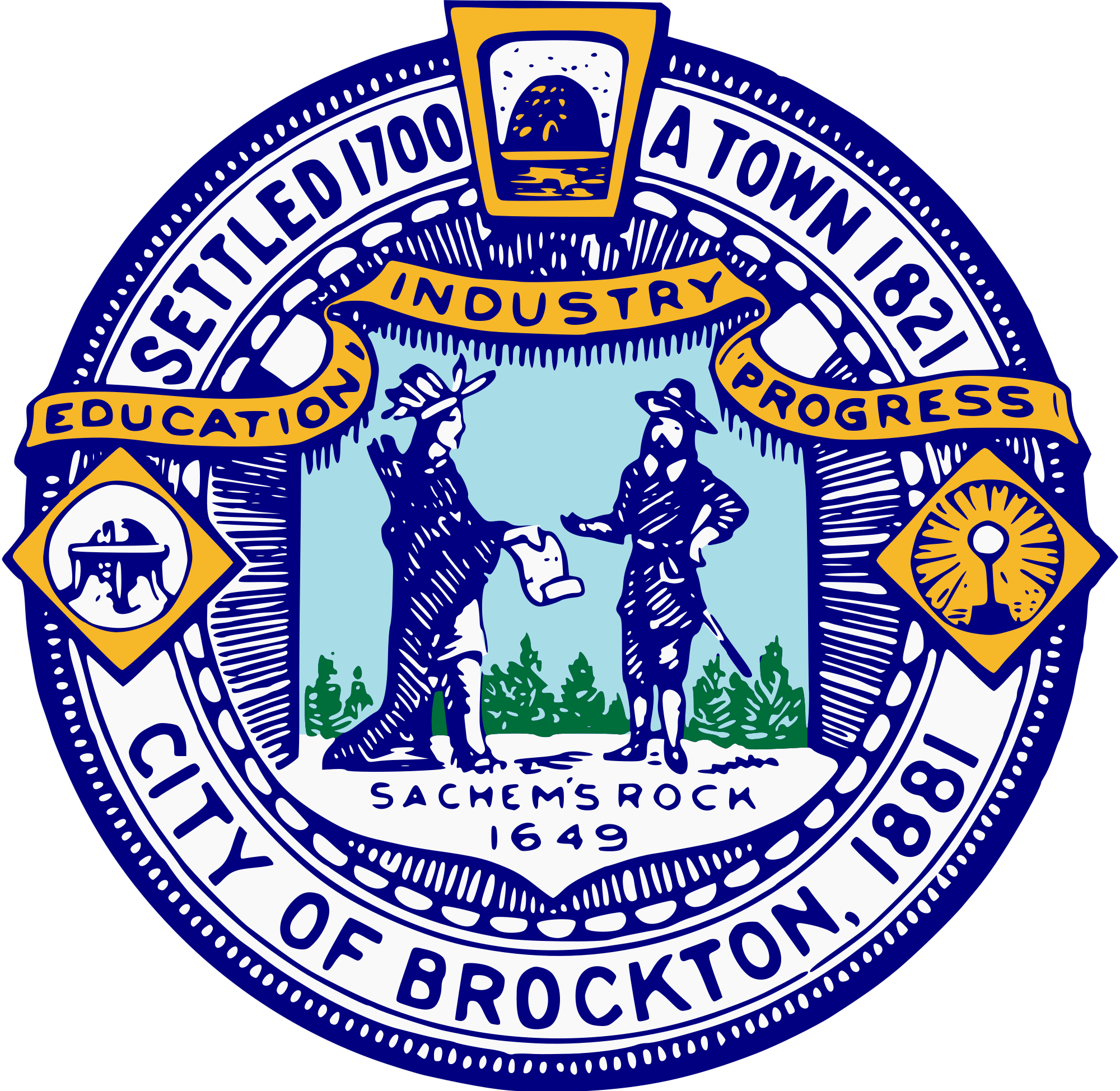 - "SETTLED 1700 A TOWN 1821" "EDUCATION INDUSTRY PROGRESS" "SACHEM'S ROCK 1649" "CITY OF BROCKTON, 1881"