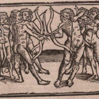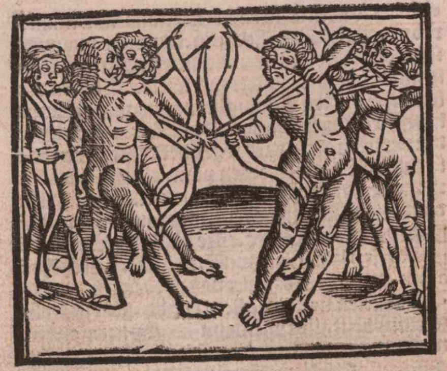 Two groups of Indigenous Brazilians face each other in preparation for combat. All are nude, and members of both groups hold bows and arrows aimed at the opposing group.