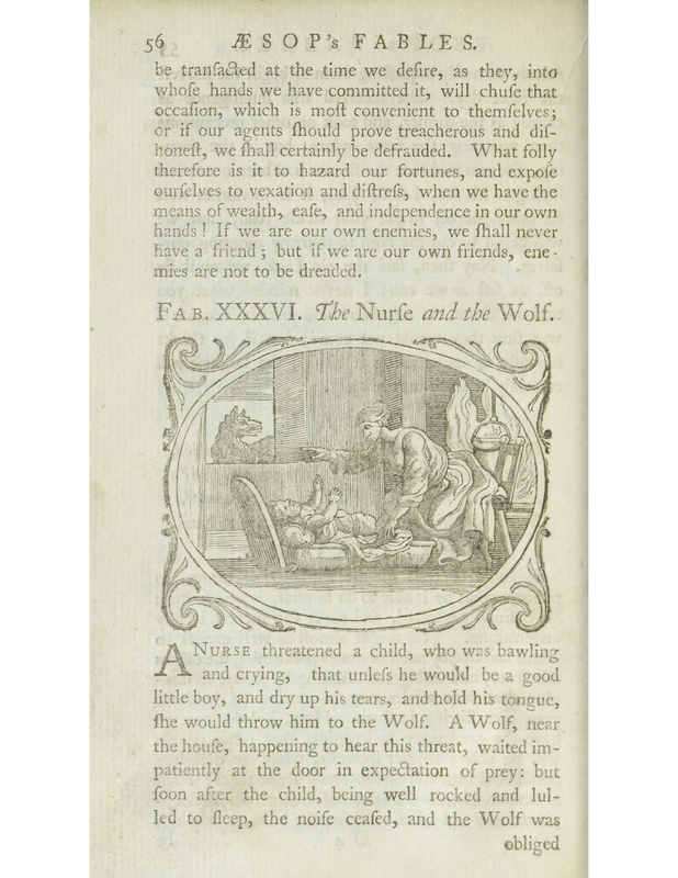 A woman sits on a chair on the right side of the image, hovering above a child on a small bed. She points outside to a wolf who is peeking through the window. She appears angry, while the child seems to be in distress, with their arms held in the air. In the background, a fire rolls with a large pot hanging above.