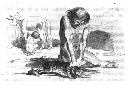 [a yahoo kills its cat while another drinks from the udder of a cow]