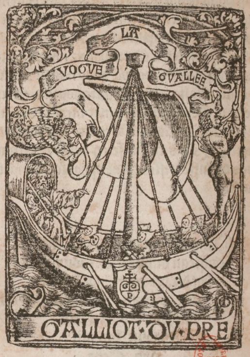 This illustration (the publisher’s mark) depicts a galley with six rowers sailing on the water. The leftmost figure on the ship, an older bearded man, is directing the rowers. He has a pole-like object in his right hand, perhaps a cane, walking stick, or scepter of some sort. Directly above him, there is what looks like an angel playing a horn. The rightmost figure is also playing a horn; unlike the other horn player, however, he does not have wings, and as such is not intended to represent an angel. The publisher’s crest or emblem can be seen in the center of the ship’s hull. The main part of this emblem is shield-shaped and contains the letters ‘G – D – P’ for Galliot Du Pré. Emerging from the top of the shield is a patriarchal cross, a version of the Cross of Lorraine.