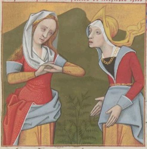 This illumination depicts the wives of the Minyans, who were companions to Jason. The wives of the Minyans had devised a plan to save their husbands from execution. They had gone into the jail cell where their husbands were kept, and quickly swapped clothing with them so that their husbands were dressed in womens clothing. The men walked out to freedom, and the wives took the place of their husbands in execution. Boccaccio wrote on these women to highlight their devotion to their husbands, and their courage for condemning themselves to save their loved ones.