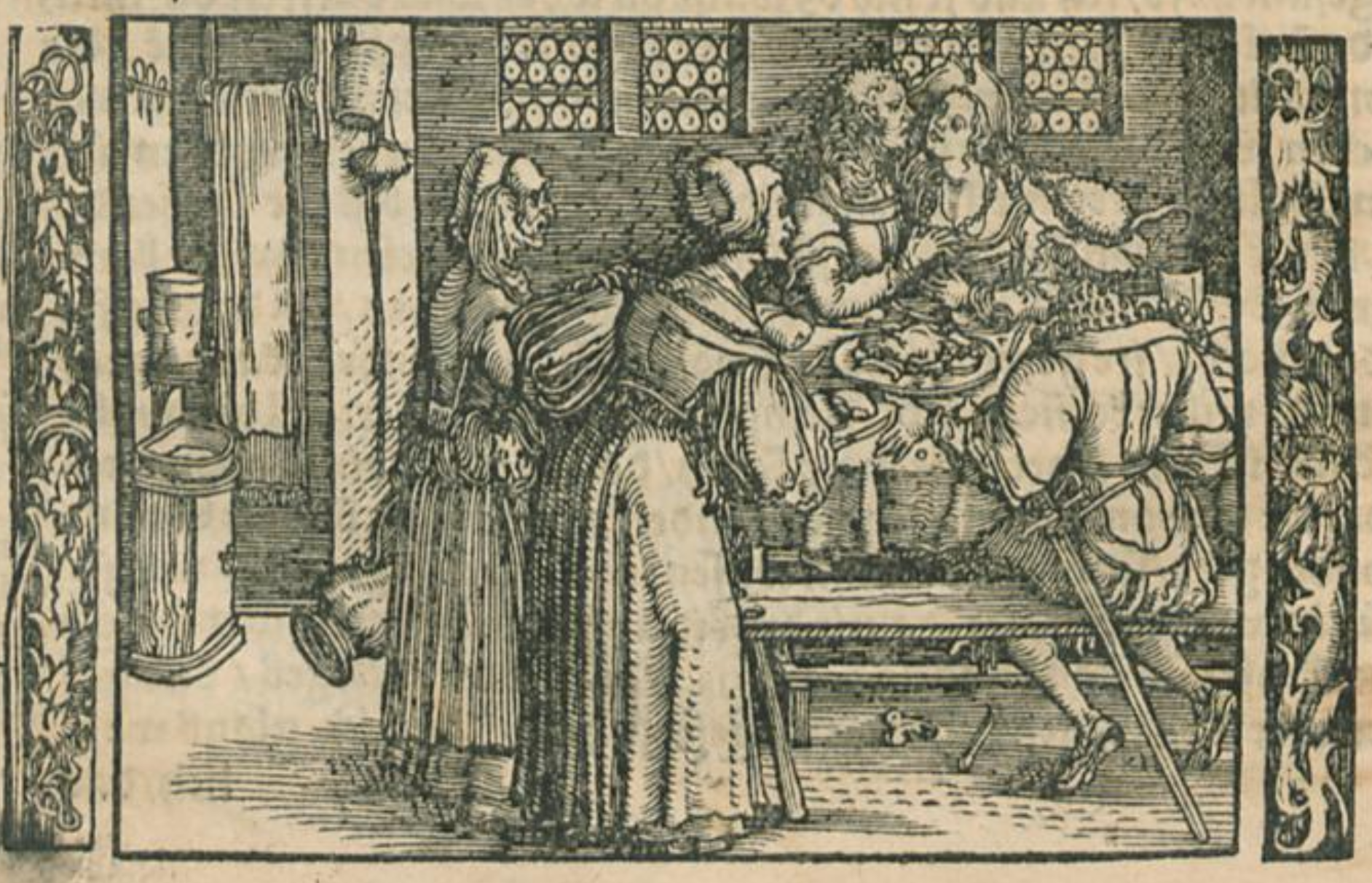 Celestina, Elicia, Sempronio, Areusa, and Pármeno (in clockwise order, starting from leftmost figure) are gathered around a table at Celestina’s house for dinner. While the two pairs of lovers dine, Celestina drinks her wine. Sempronio starts praising the beauty and virtue of Melibea, which enrages Elicia and causes her to become jealous. (She is standing with her back hunched over, and Sempronio has his left hand open, both of which signal an argument.) Celestina manages to calm her, and the two lovers reconcile. Lucrecia arrives shortly thereafter, and she tells Celestina that Melibea has asked to have her girdle returned. More importantly, Lucrecia informs Celestina that Melibea has an illness of the heart and has requested her presence.
