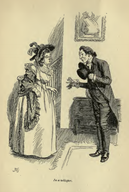 In this image Mr. Donovan tells Mrs. Jennings that Lucy Steele and Edward Ferrars’ engagement had been announced and sent Fanny Dashwood into hysterics upon hearing the news. Mr. Donovan was the apothecary and Mrs. Jennings encountered him while visiting her daughter, Mrs. Palmer, who called Mr. Donovan because her newborn was ill. Mr. Donovan had been to see Fanny Dashwood earlier that day, and told Mrs. Jennings to pass on the news to Elinor and Marianne. This scene occurs in chapter 37. The characters are shown in the traditional regency style, as Mrs. Jennings wears regency style dresses with an empire waistline. She has a bonnet and a shawl wrapped around her shoulders. Mr. Donovan wears a waistcoat and tailcoat, with breeches and holds a top hat. Edward wears a waistcoat and tailcoat with breeches. The regency period dated to the early nineteenth century (1811-1820) when George, Prince of Wales, later George IV (r. 1820-1830), reigned as regent for his mentally ill father, King George III (r. 1760-1820). The regency period is associated with the rise of neoclassicism in art and fashion.