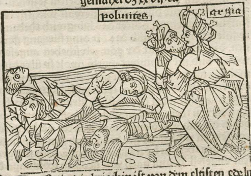 Argia, the daughter of King Adrastus of Argos is depicted on the right side of the engraving holding the body of her husband, king Polynices of Thebes. We know that these figures are Argia and Polynices as the creator engraved their names above their bodies. Boccaccio explains that Polynices had fought in a war against his brother Eteocles and died on the battlefield. Argia snuck herself onto the battlefield after the war to see her husband’s body. She is depicted holding his lifeless body and kissing him on the lips. Behind Polynices are the other men who had fought and died in this war.