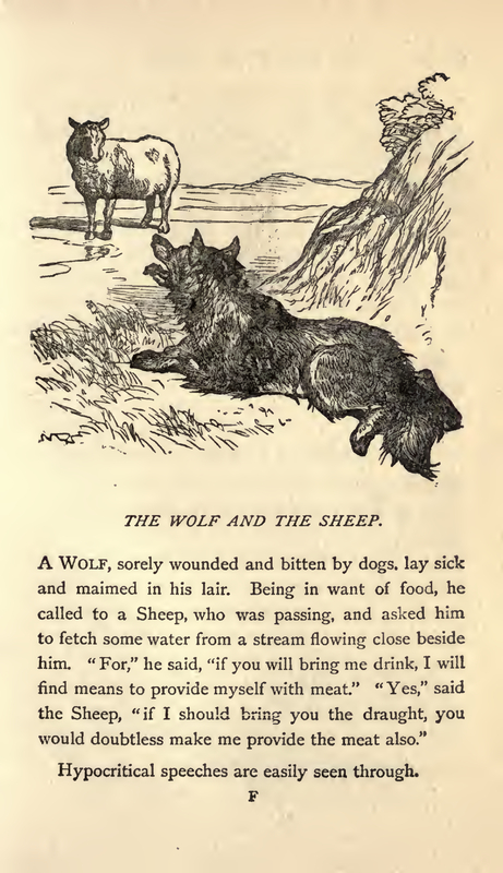 - a wounded wolf seeking for help by a sheep with the intention to eat the sheep.