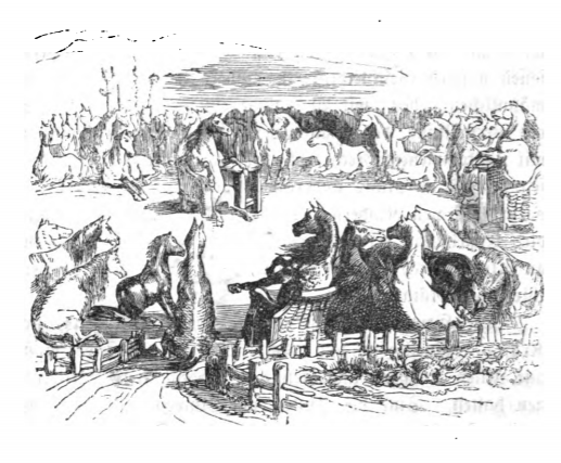 Every four years a representative council of the Houyhnhnms meets in a large plain about twenty miles from the house where Gulliver was staying. They discuss the conditions of the different districts of the country. This includes anything that a district is lacking, including hay or oats, as well as the regulation of children. The same image appears in the 1843 Krabbe edition.
