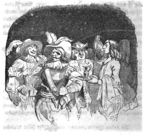 Here we see one of the great European kings with their ancestors. Much to Gulliver’s surprise, many kings had ancestors who were not royal. Some families had fiddlers, courtiers, barbers, and prelates as ancestors, rather than a line of royalty. Gulliver amused himself by tracing different features through family lines, both physical attributes and characteristics of one’s personality. The same image appears in the 1843 Krabbe edition.