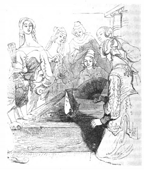Here Gulliver sails on a boat made for him after telling the queen about his travels. The queen had a boat and a trough built for Gulliver to sail on and entertain the court. The trough is surrounded by the women of the court, all wearing long embroidered dresses with caps and veils. Some of the women hold fans, which was customary of court life in the eighteenth century. On the left-hand side, we see the queen’s dwarf, looking angrily at Gulliver, resentful of all the attention Gulliver was getting. The same image appears in the 1839 Krabbe edition.