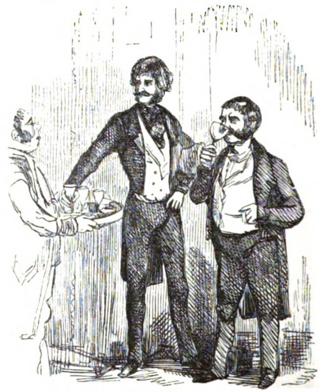 Lord Steyne, the scar on his forehead visible from when Rawdon Crawley threw his diamond back at him, drinks from a wine glass at Prince Polonia’s ball. He is standing next to a taller man, who is reaching out to take a glass from the tray a nearby serving man holds.
