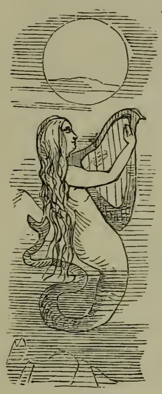 A mermaid with long hair and a thin twisting tail floats near some rocks, mostly out of the water. She is playing a small harp beneath the full moon, which forms the letter O from “Our”.