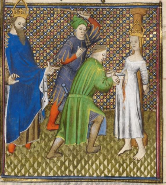 This illumination depicts Agrippina, the mother of Emperor Nero, being murdered. She is illustrated in a white dress as a man cuts through her abdomen. There is another man swinging a club above his head. Emperor Nero is illustrated on the left side of the image pointing his finger towards the men, which symbolizes his orders to have his mother killed.