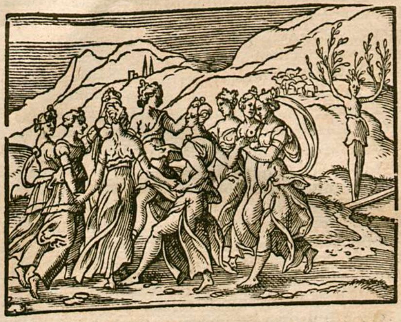 This engraving depicts a group of nymphs gathered in a circle, dancing and skipping. The nymphs had been approached by a shepherd from Apulia had come across the nymphs and began to mock them by imitating their dancing and cursing at them. As punishment, the nymphs transformed him into an olive tree. The shepherd in his transformed state is illustrated in the background of the engraving on the right-hand side of the image. The nymphs continued to dance and enjoy themselves after the transformation of the shepherd.