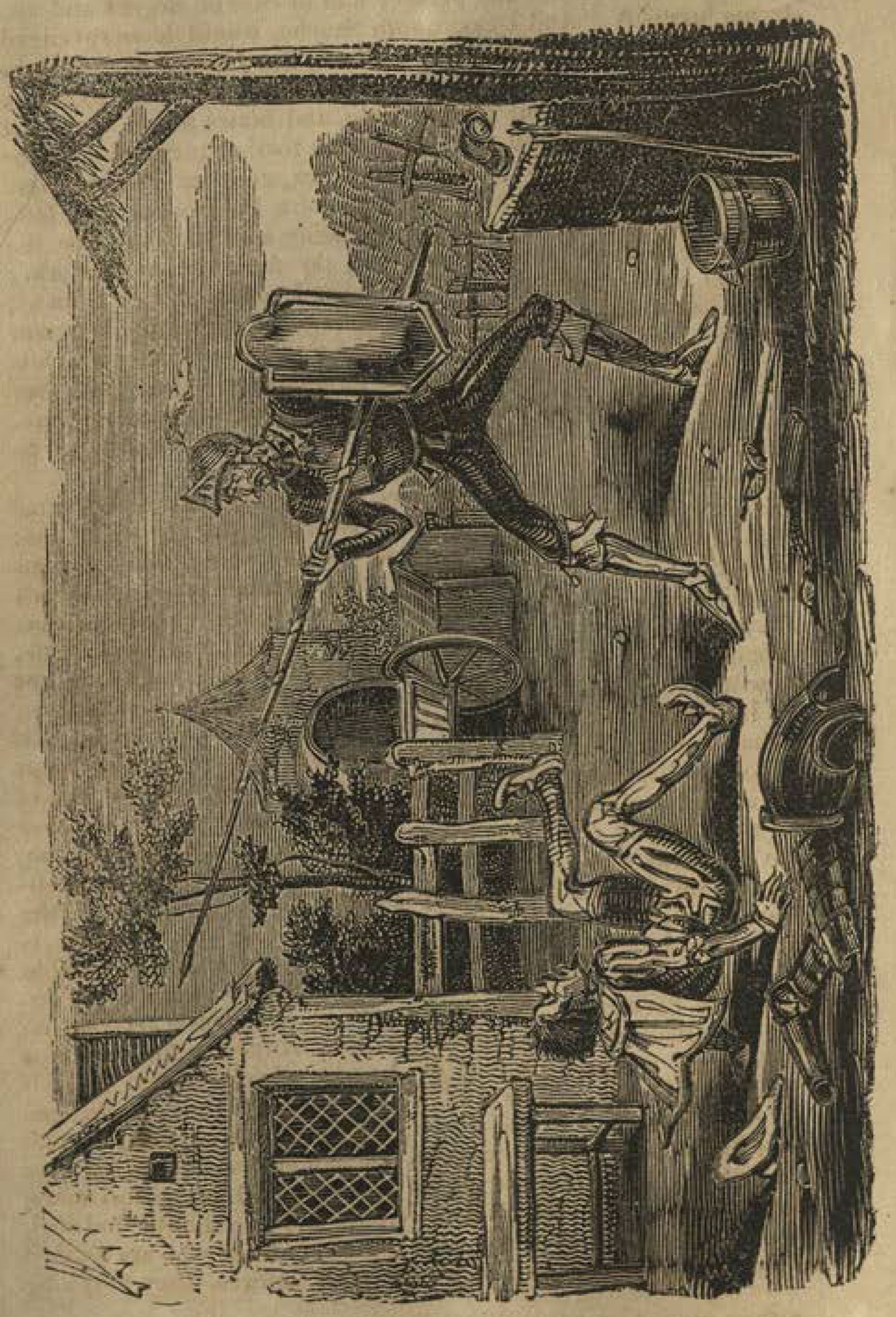 Insulted that the Courier (left) removed his armor from off the cistern pictured on the right and moved it to the foreground, Don Quixote (right), clad in armor, lifts his lance in his right hand to deliver a blow upon the courier who he mistakes for a knight. The courier falls onto the ground in fright, trying to scuttle away from Quixote.