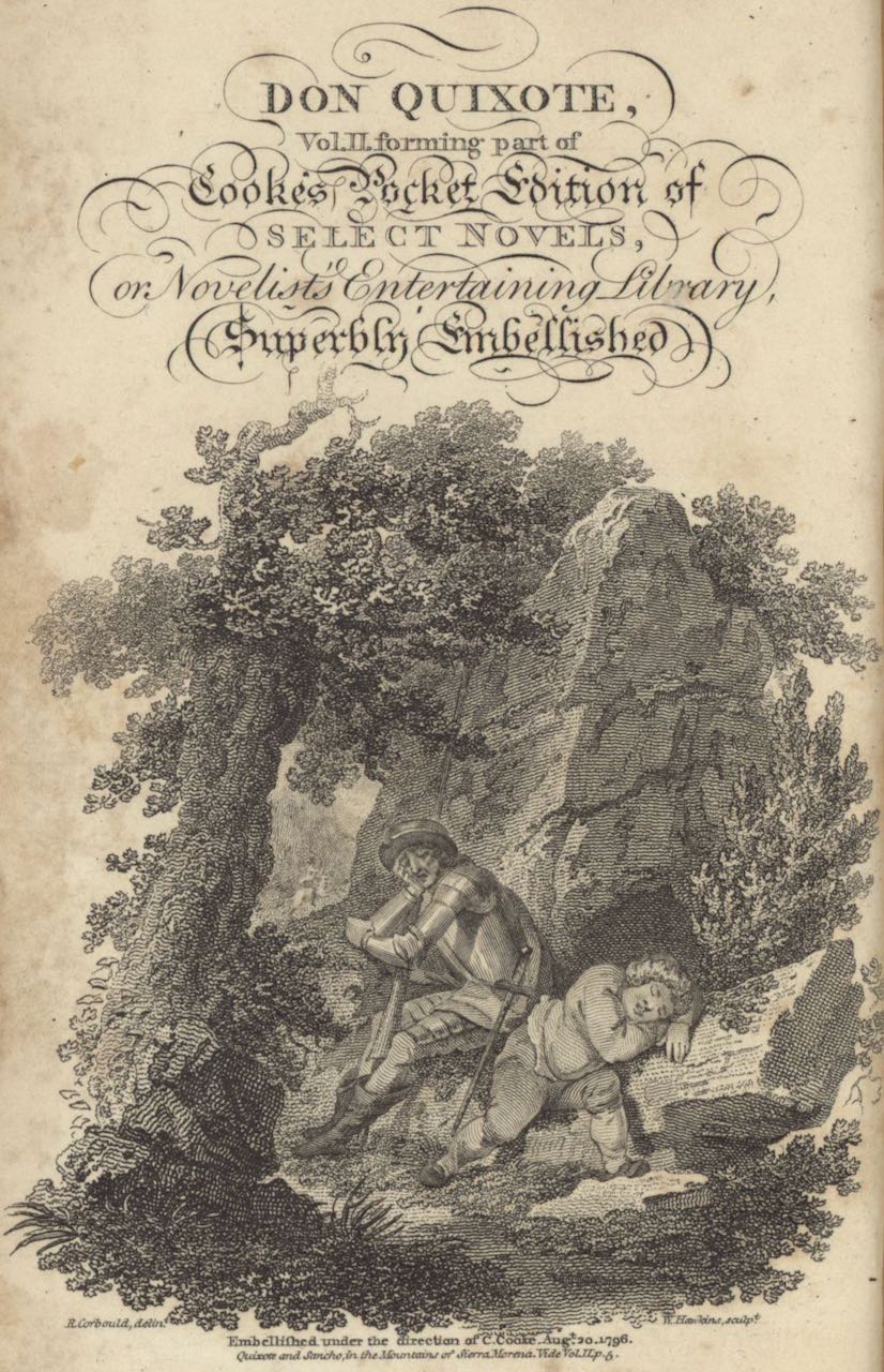 - Vignette on title page. Don Quixote and Sancho Panza sleeping in Sierra Morena. Signed by R. Corbould (illustrator) and W. Hawkins (engraver), dated 1796. Part 1, ch. 23.