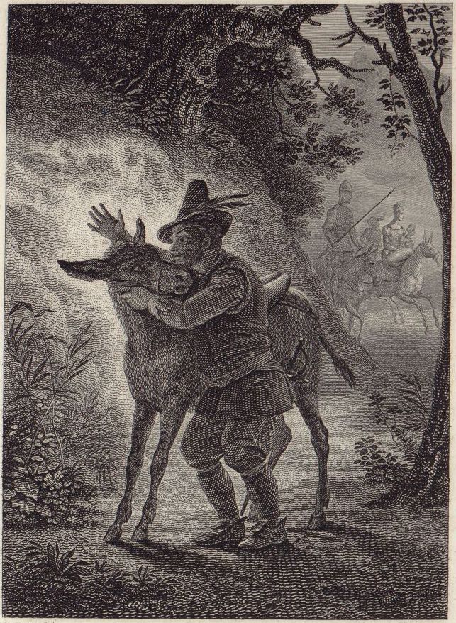 After leaving Sierra Morena, the travellers encounter Ginés de Pasamonte and Sancho Panza’s stolen donkey. Sancho, reunited with his donkey, embraces it while Ginés de Pasamonte runs away (not pictured). Don Quixote, Dorotea, the barber, and the priest look on (background). Signed by E. Vernet (illustrator) and E. Lignon (engraver). Part 1, ch. 30.