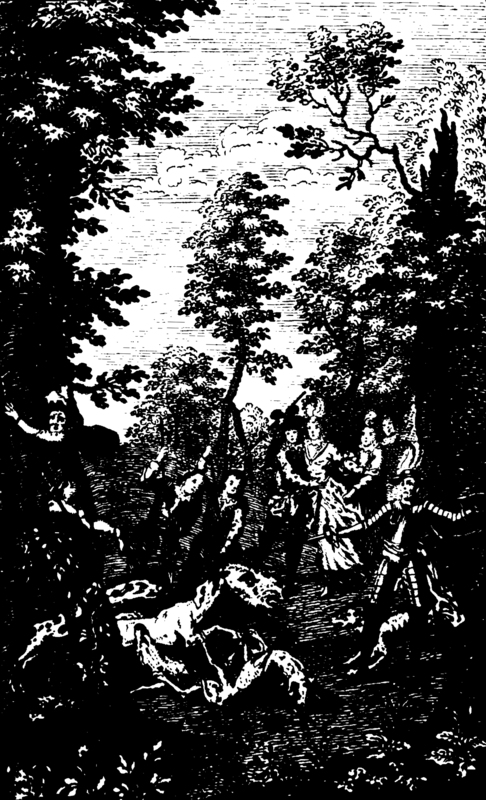 Don Quixote, Sancho Panza, the Duchess, the Duke and all their servants participate in a great hunt led by hunting dogs. They are met on their hunt by a large boar who mashed its teeth against its tusks and foamed at the mouth. Seeing the boar, Don Quixote (pictured pointing his sword at the felled boar) grasped his shield drew his sword and prepared to receive the boar head on alongside the Duke (pictured holding the duchess in the background). The Duchess was the most prepared of all of them, but the Duke insisted that she step back. Sancho Panza meanwhile resolved to run away, and leaving Dapple, he scuddled towards an oak, but fell while climbing and was caught by a snag. Suspended above the boar, Sancho yelled and bellowed as if he was being devoured until the tusky boar was laid to rest.