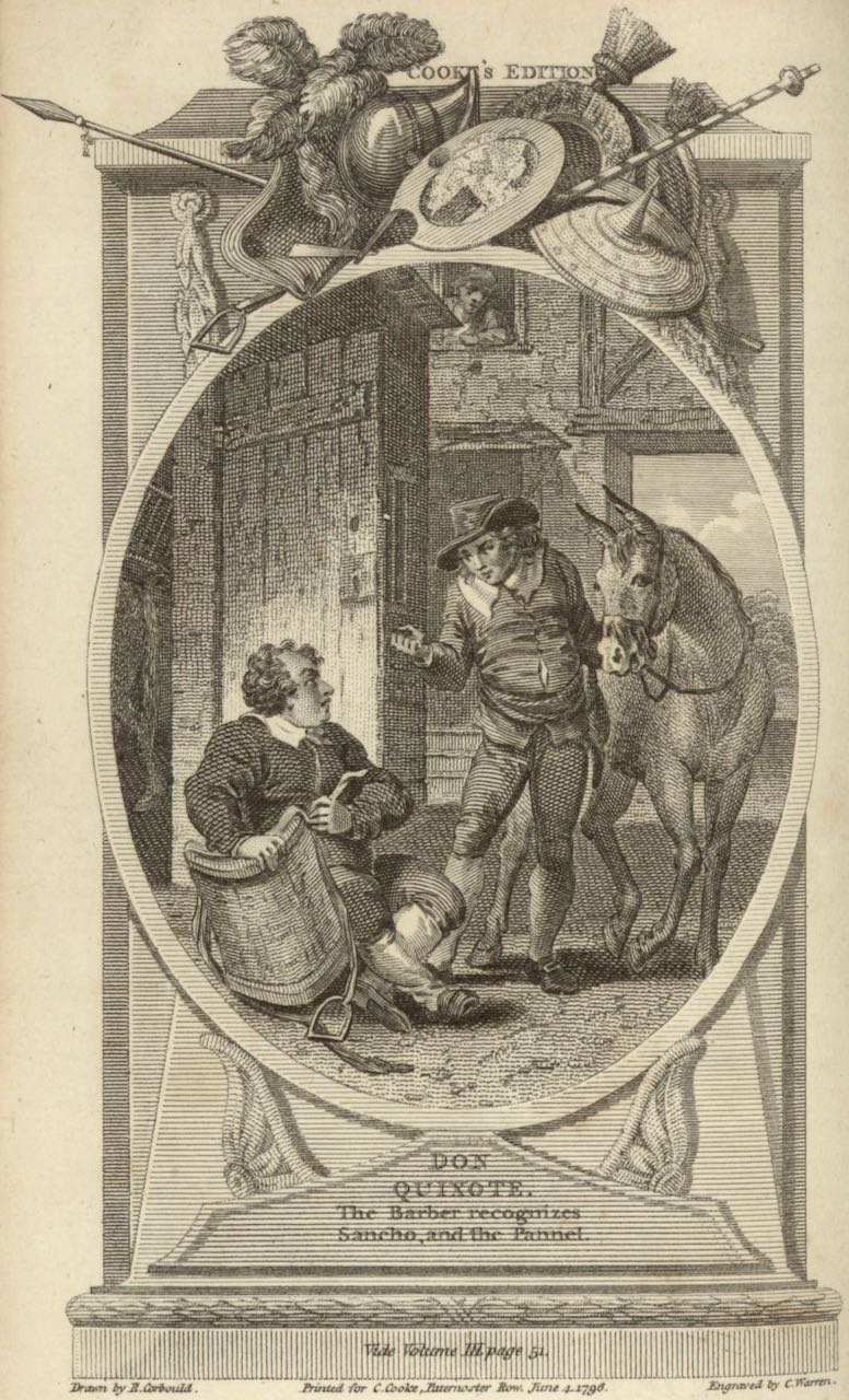 In the inn’s stable, the barber encounters Sancho Panza and demands that he return his packsaddle and basin. The illustration is set in a decorative and architectural frame, complete with a lance, an arrow, a shield, and a helmet. Signed by R. Corbould (illustrator) and C. Warren (engraver), dated 1796. Part 1, ch. 44.