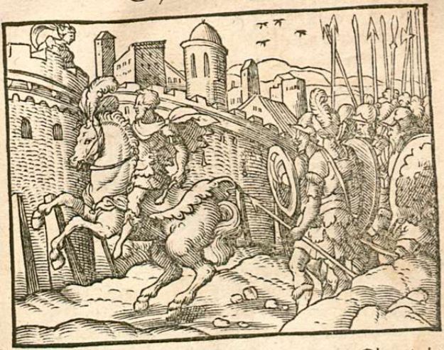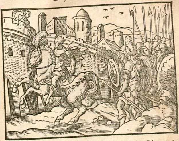 This engraving illustrates King Minos of Crete waging war on the city of Megara. He is illustrated riding his horse with his soldiers behind him. In the top left corner of the engraving, there is a woman illustrated looking over the battles. This woman is Scylla, the daughter of King Nisus of Megara. Scylla falls in love with King Minos as she watches him from her city walls and ends up betraying her father and city as her love for King Minos over-powers her.