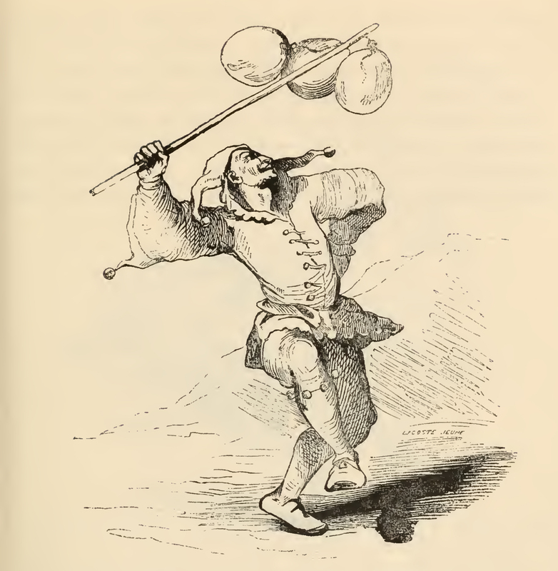 - While Quixote converses with the players on their cart (not pictured), there came upon the company a court jester, his clothes being adorned with little bells, carrying at the end of a stick three blown ox bladders that he shook and danced around with.