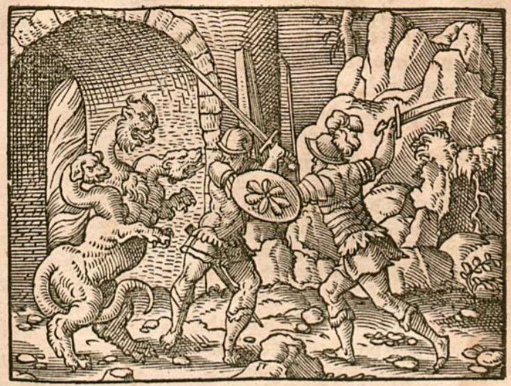 In order to poison her stepson Theseus, Medea planned to use a poisonous mixture of aconite. It is suggested that aconite came from the mouth of the three-headed beast named Cerberus, which guarded the Underworld. When Hercules had chained up Cerberus and brought him up from the Underworld, he started foaming at the mouth when he saw daylight, which turned into aconite when it touched the ground. The image illustrates Hercules, presumably fighting off Pluto, god of the Underworld, in order to chain up Cerberus and bring him above ground.