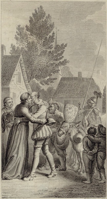 The priest greets Don Quixote and Sancho Panza upon their return to the village, embracing Don Quixote. In the background, several houses of the village and a church steeple are pictured. Signed by D.-N. Chodowiecki (illustrator) and D. Berger (engraver), dated 1781. Plate C.IV. Part 2, ch. 73.
