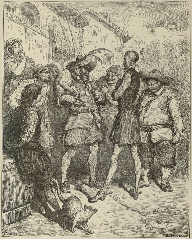 At the inn, Sancho Panza gives Maese Pedro two reales and asks the monkey to tell him what his wife Teresa is doing and how she is spending her time. The monkey leaps on the puppet master’s shoulder and clicks his teeth together, making as if he were whispering the answer to the question in his ear. Maese’s left eye is covered with a patch of green taffeta. Signed by G. Doré (illustrator) and H.-J. Pisan (engraver). Part 2, ch. 25.