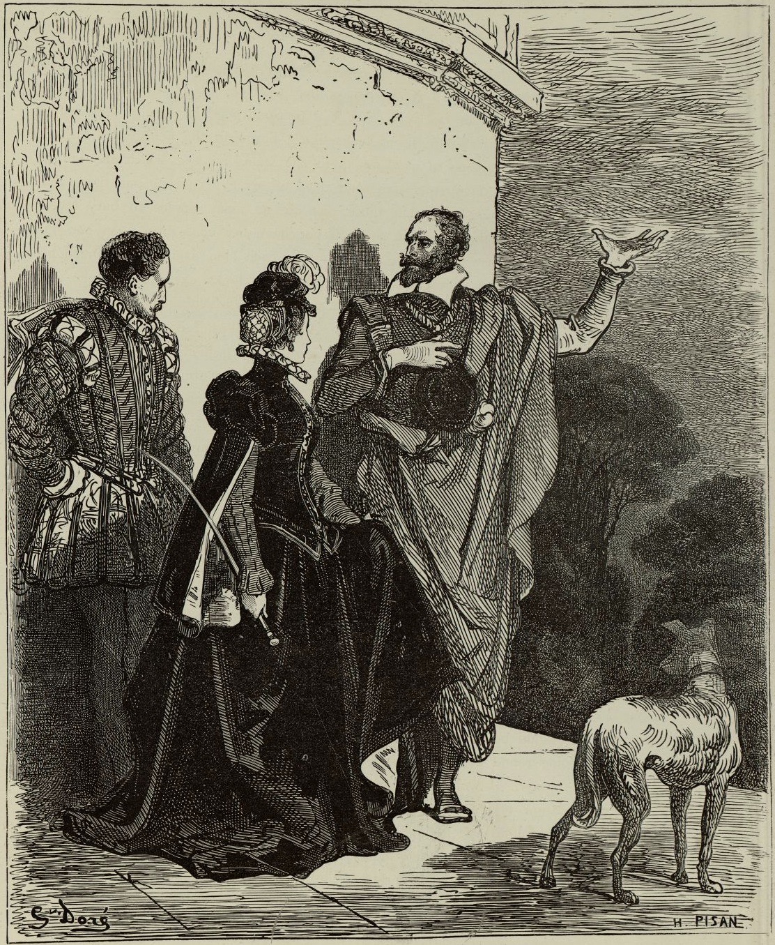 Seeking to abandon the idleness in which he had been living in the castle, Don Quixote asks the duke and duchess for permission to leave. They grant it, telling him that it grieves them deeply that he is going. Signed by G. Doré (illustrator) and H.-J. Pisan (engraver). Part 2, ch. 57.