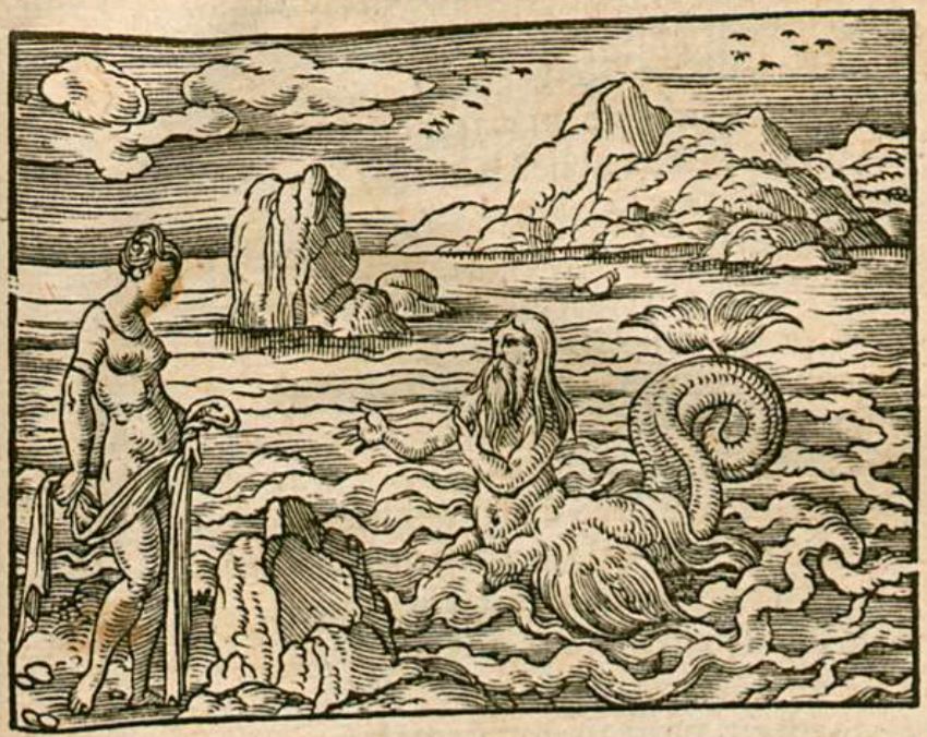 This image depicts the sea-god Glaucus emerging from the water as he speaks to the beautiful Scylla, who is depicted standing on land. Glaucus is depicted as half-man, half-fish, with the lower half of his body in fish form. Scylla was frightened by Glaucus’ appearance, so he assured her that he used to be a mortal fisherman but was transformed into a sea-god. While telling his story to Scylla, she was repulsed by his appearance and ran away from him. Glaucus was enraged at Scylla’s disgust towards him, so he went to seek out Circe for help in getting a love potion to give to Scylla.