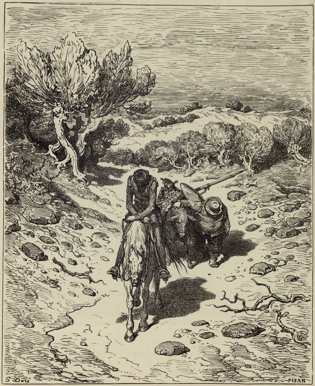 - Don Quixote and Sancho Panza make their way back to their village. Signed by G. Doré (illustrator) and H.-J. Pisan (engraver). Part 2, ch. 66.