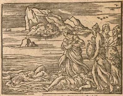 This engraving illustrates Hecuba, the wife of King Priam of Troy, mourning over the loss of her children who had been killed as a result of the Trojan War. She is illustrated standing above her daughter Polyxena’s body, with other Trojan women by her side. While lamenting about Polyxena’s death, a body washed up on the shore. The body is her son, Polydorus, who had been murdered by King Polymestor.