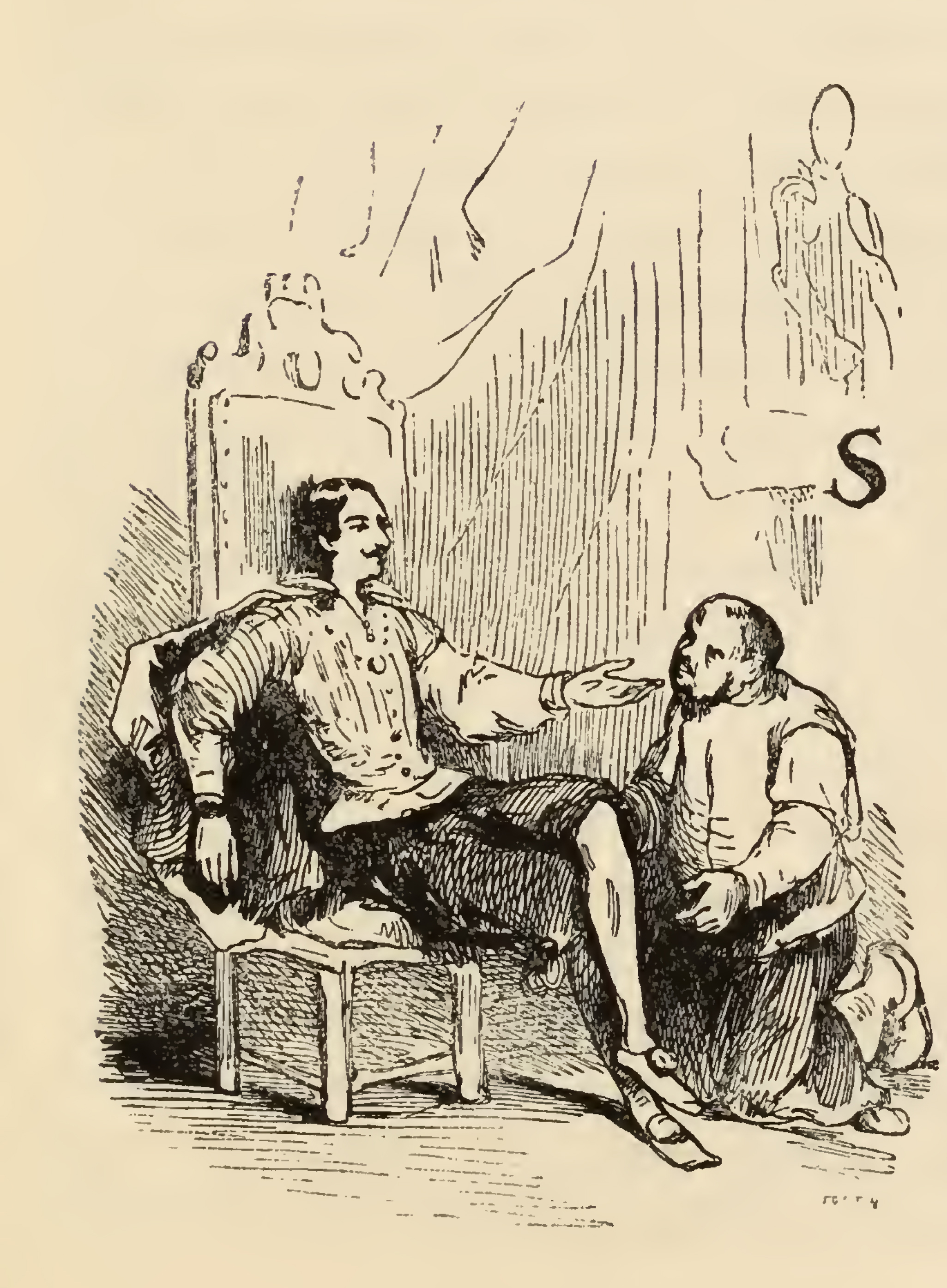 Sancho Panza (right) falls to his knees, his arms bent by his side, facing the Duke in preperation to kiss his feet for promising Sancho governance. The Duke (left) sits upon a regal chair with a tall backing, his legs crossed and his left harm extended amiably, with his right arm hanging comfortably on an armrest, his black cape draped behind him. Upon his neck he wears a golden medallion of sorts. In the background on the right there is a portrait of someone.